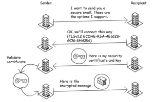 Establishing how the data will be encrypted happens in an email exchange. The sending server ‘asks’ the receiving server to accept a TLS connection, and shares a list of protocols for the recipient to choose from. The receiving server then sends back their chosen security certificate and public encryption key.