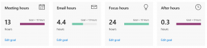 These statistics are based on your email and calendar settings. So in the week shown here, I had 13 hours of meetings scheduled in my calendar. The measure for focus hours is around having blocks of time at least two hours long that aren’t interrupted by meetings. You can go in and set goals for these settings and scroll back week by week to see how you measured against those goals.