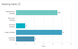 The further you get down into the page, the more detail you get on your behaviour. I can look at the graph below and get called out on the fact that I was responding to emails when I was in a meeting (that’s what the multitasking bar represents) but at least I didn’t have any meetings outside of business hours on this week.